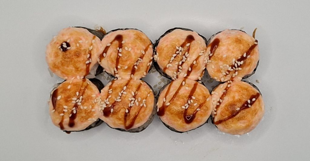 Курица, огурец, майонез, масаго, сыр,соус унаги, кунжут