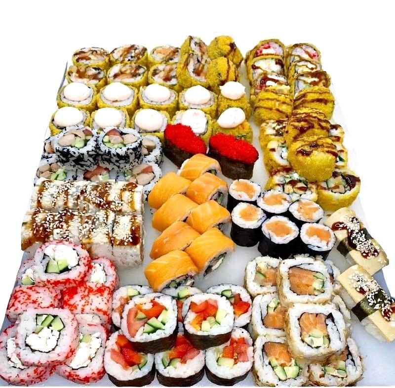 Состав: филадельфия, канада, калифорния II, бонито, аризона, македония, колорадо, осака, овощной, сяке маки, суши томаго 2, суши тобико 2
