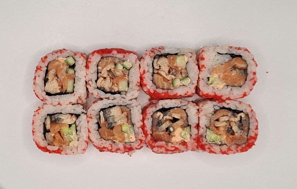 Состав: Рис, угорь, лосось, спайси соус, масаго, огурец
